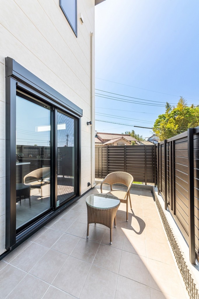 テラスにはリゾート地等でも使われるラタン調家具を合わせました。